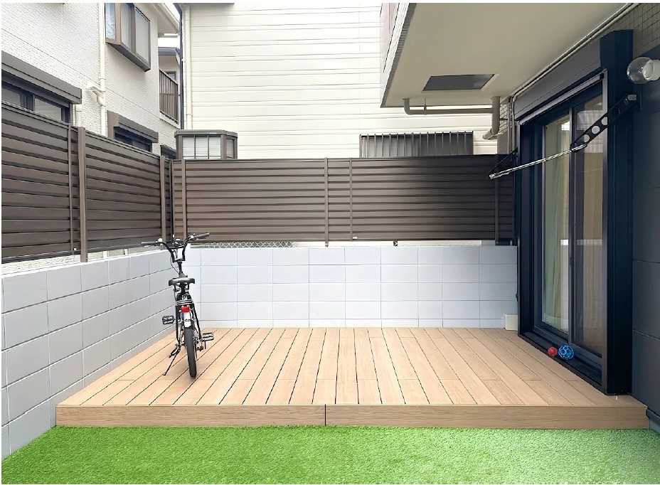 【施工事例ご紹介】アスファルト駐車場スペースを人工芝と人工木でお子さまが遊べる空間に「川崎市中原区 マンション専用庭 樹脂木デッキ」