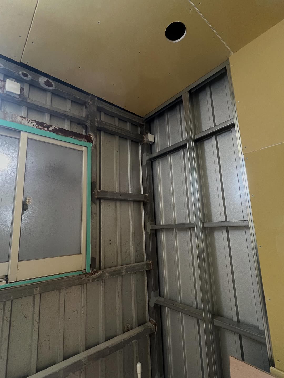 こんにちは!すみれ工務店ブログ担当です🌺今回は、宮古島市内で行った店舗リフォーム工事の下地・ボード施工の工程をご紹介します。🔵下地・ボード施工の様子解体が終わると、次は壁や天井の軽量鉄骨下地(軽天)施工を行います。この工程では、最終的な壁面の強度や平滑さを左右するため、寸法精度を意識して組み立てを行いました。その後、石膏ボードの貼り付け作業へ。ビスの間隔や位置を一定に保ちながら、壁全体を仕上げていきます。リフォームのご相談・求人応募はお気軽にどうぞ!
