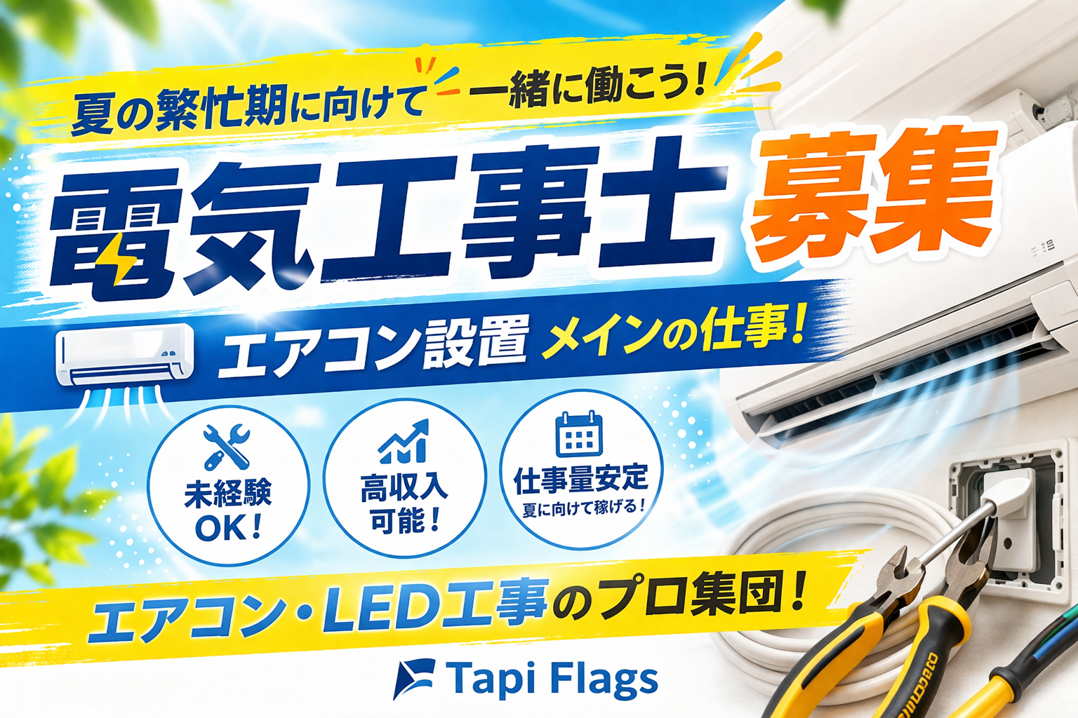 夏に向けて需要増加🔥電気工事士募集|株式会社Tapi Flags(群馬県・埼玉県北部)