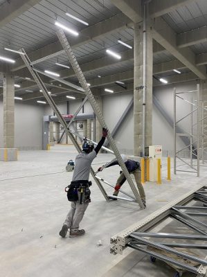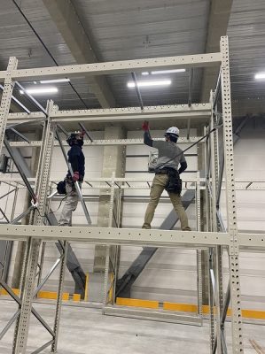 当社の仕事は工場や物流センター内の大型棚の取付、設置や店舗やコンビニの陳列棚(什器)の設置、オフィス内の書類棚の据付、設置作業を行います。