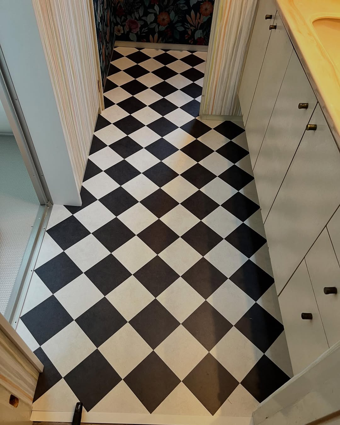【内装施工事例】市松模様のフロアタイル貼り|洗面・トイレ空間に映える150角デザイン貼り