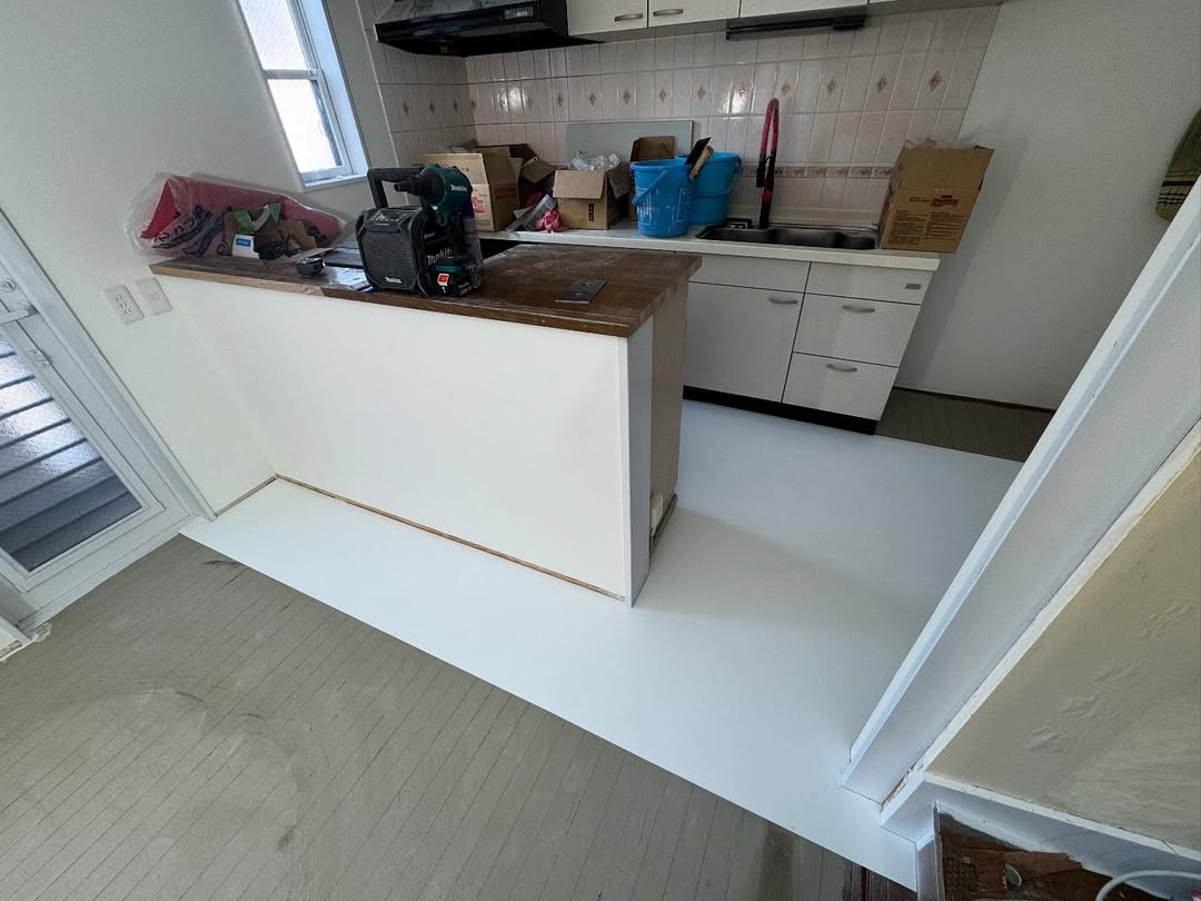 【内装施工事例】複雑なキッチン床にも対応!長尺シート転写施工で美しく仕上げました