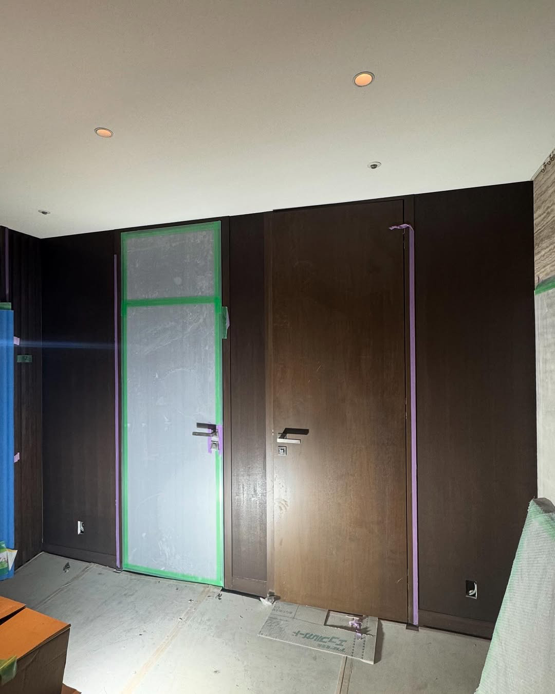 【内装施工事例】高級感あふれる天然木不燃シート貼|ウォールナット調の美しい仕上がり