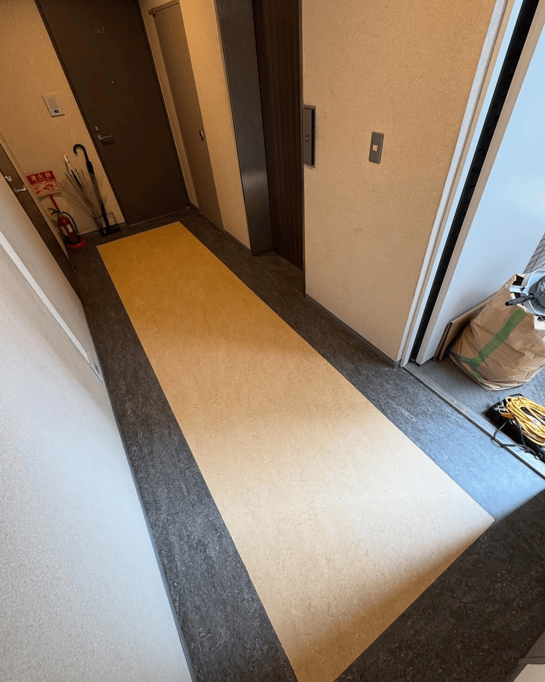 【内装施工事例】共用廊下の長尺シート貼り替え|墨田区マンションでカラー切替デザイン貼りを実施!