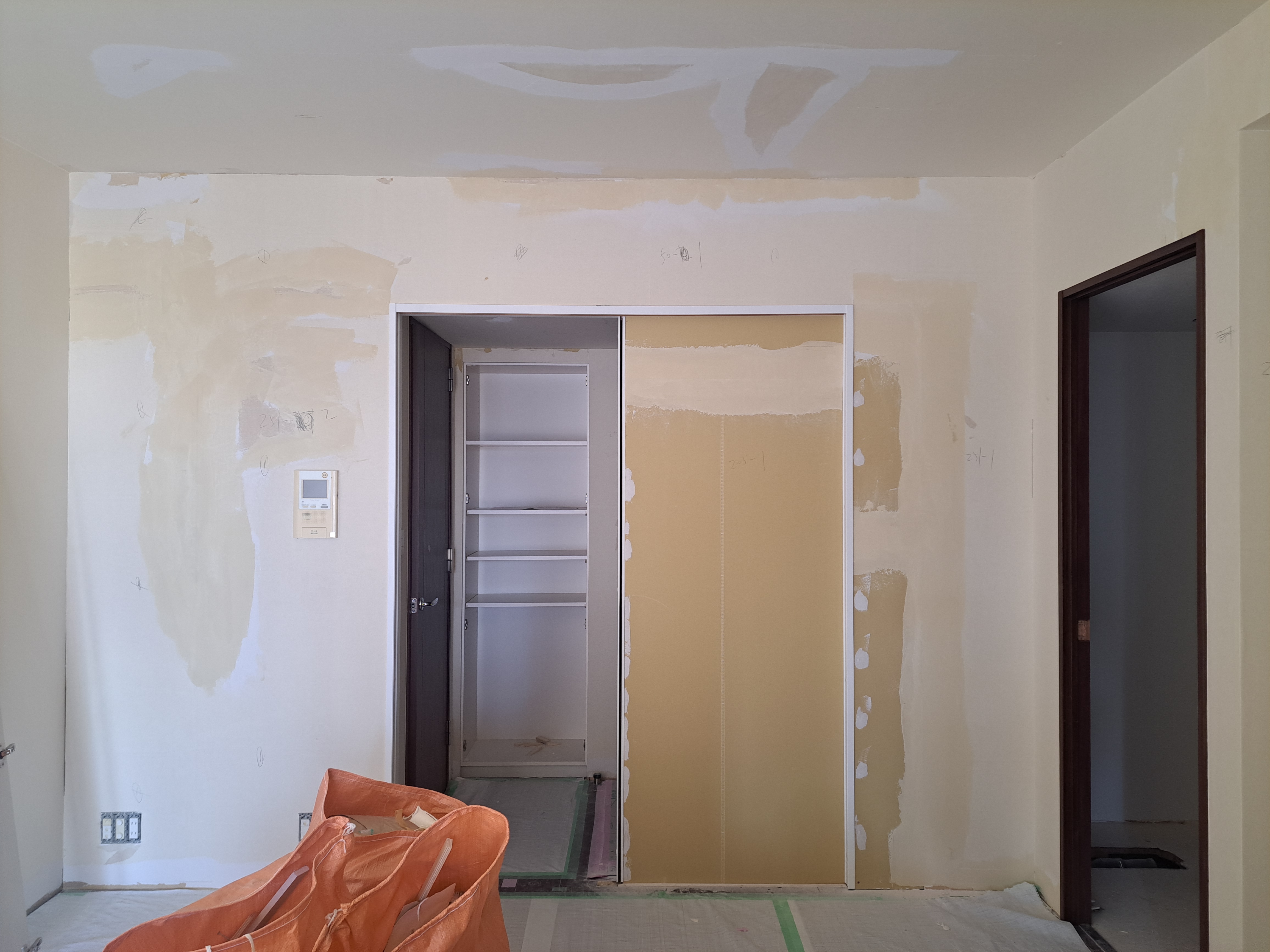 パテかい:石膏ボードをクロスが張れるように平滑な下地にする作業