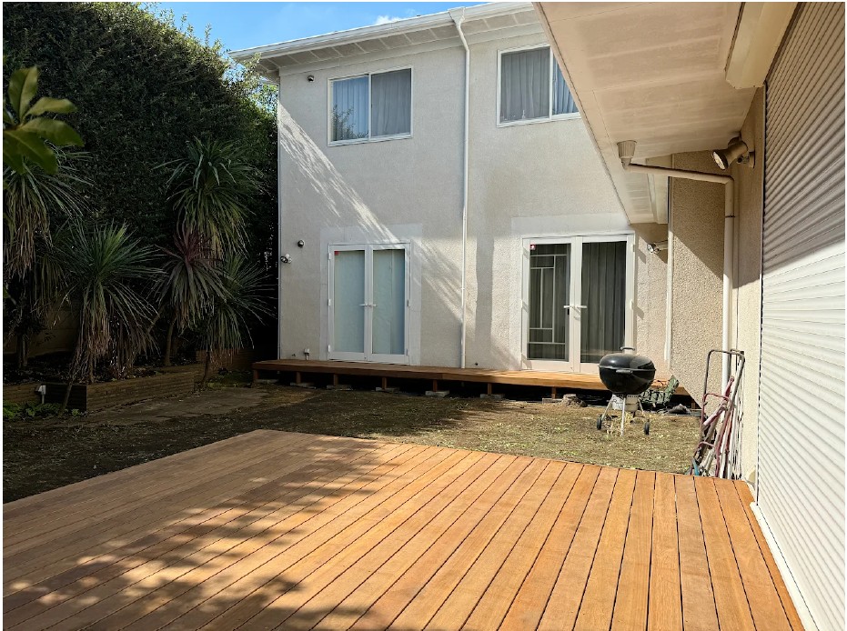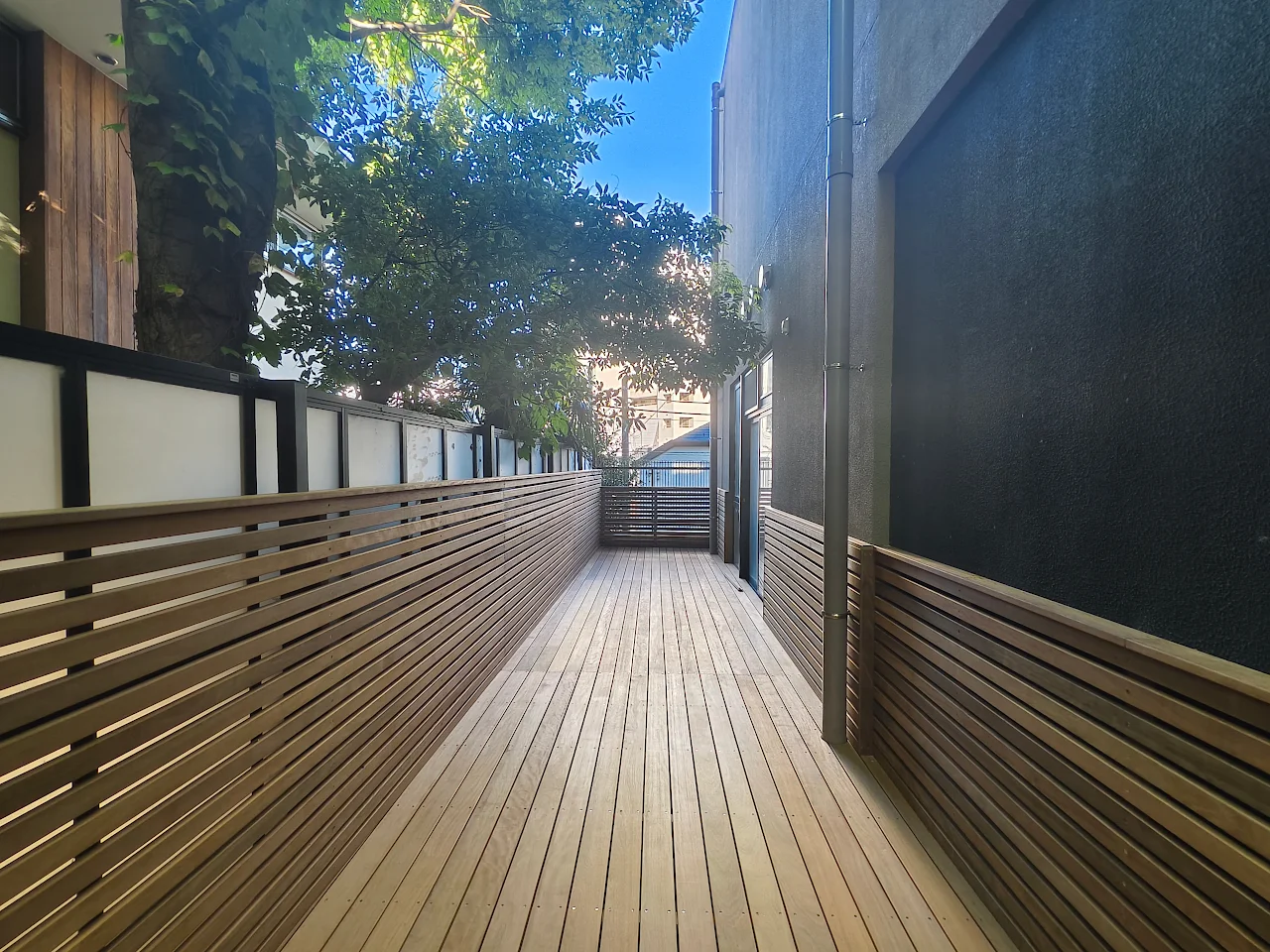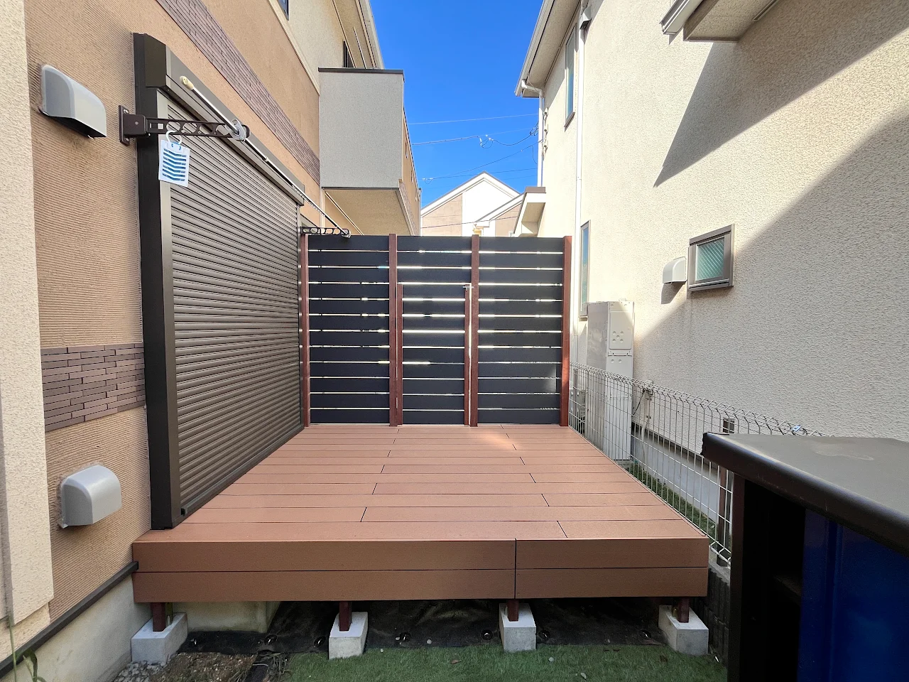 【施工事例ご紹介】DIYの人工木デッキを造り替え。ハードウッド下地で目隠し付き樹脂木デッキ「多摩区 一戸建て庭 樹脂木デッキ」