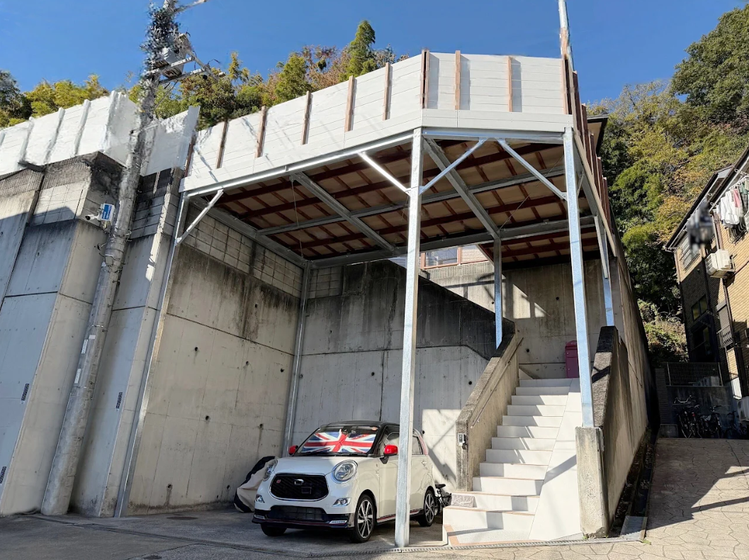 【施工事例ご紹介】高さ6mの空中鉄骨スカイデッキ(川崎市多摩区 車庫上 ハイデッキ)