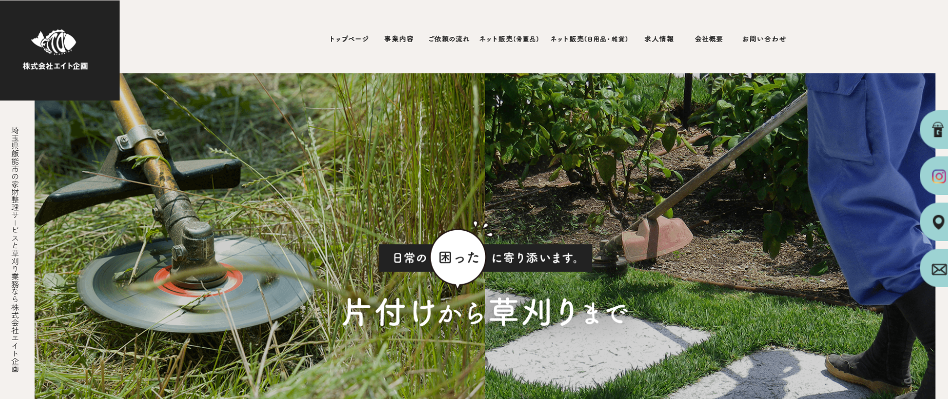株式会社エイト企画のGATEN職ページをご覧いただき、ありがとうございます。私たちは埼玉県飯能市で、不用品回収・買取、遺品整理、生前整理、草刈りなど、暮らしのお手伝いを幅広く行っています。