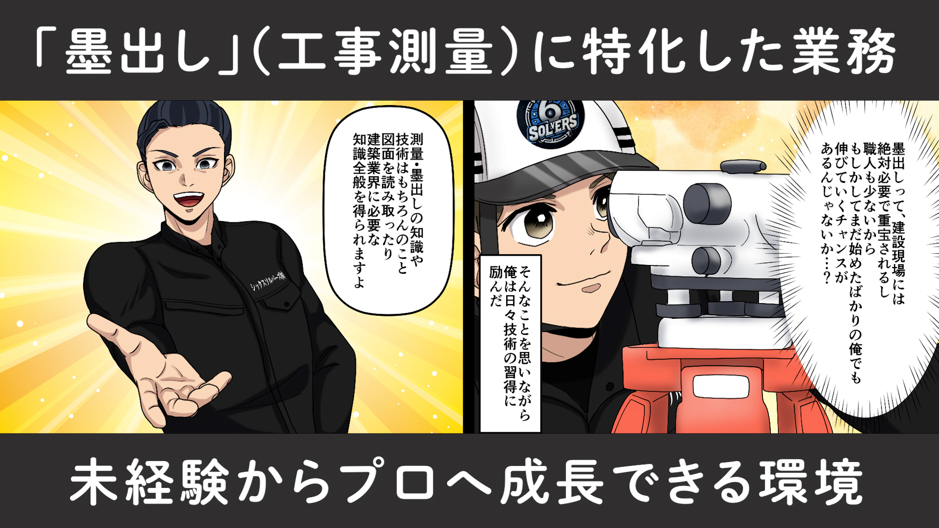 この度は、シックスソルバーズ株式会社のGATEN職ページをご覧いただき、誠にありがとうございます。私たちが携わる「墨出し」とは、測量後の現場に正確な位置を示すための目印を付け、土地の上に設計図を“実寸大で再現する”非常に重要な工程です。ひとたび位置がずれれば、工事のやり直しにもつながるため、一切の妥協が許されません。地中の配管や各種配線を含むあらゆる構造物の位置を精密に示すことで、高い精度の建設作業を支えています。