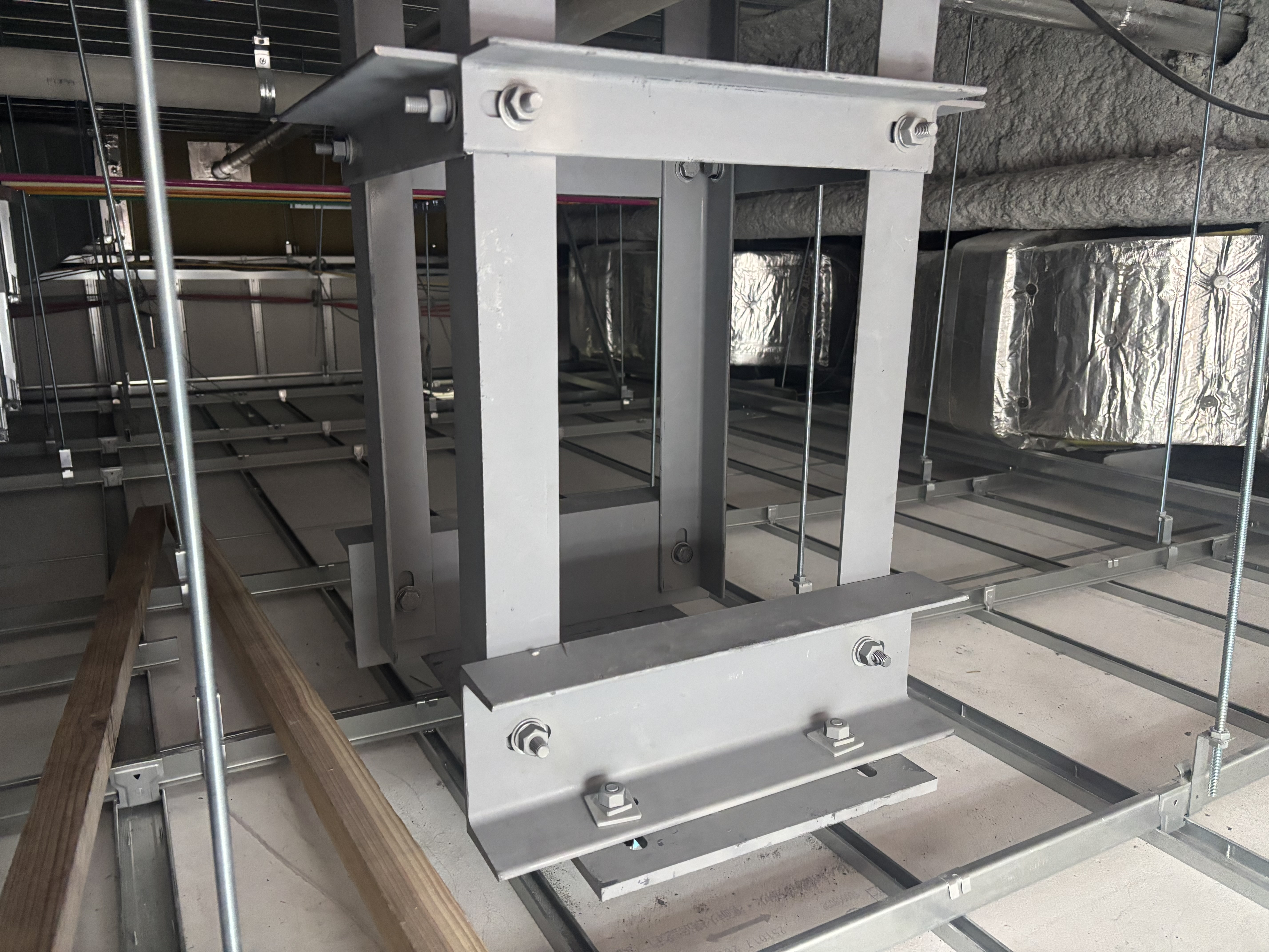 手術室の天井内部の工事風景です。 医療機器を安全に設置するための 鉄骨レールや設備を組み、 このあと天井を仕上げていきます。 最初は先輩の補助からスタートし、 少しずつ作業を覚えていきます。