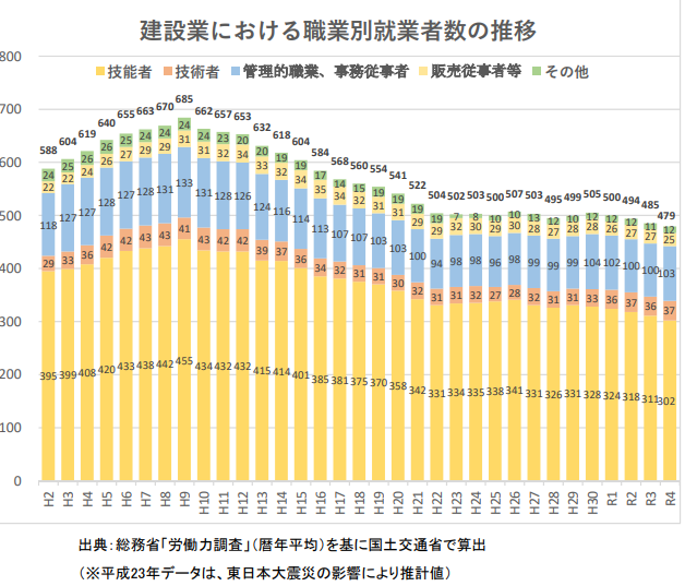 建設業界の人手不足は深刻な問題であり、 令和4年の建設業就業者数は479万人で、ピーク時(平成9年平均)から約30%減少しています。