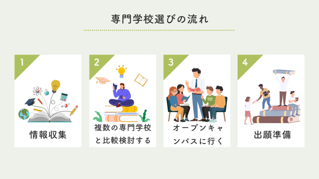 専門学校選びは「情報収集」「比較・検討」「体験・確認」「出願準備」で進められていきます。