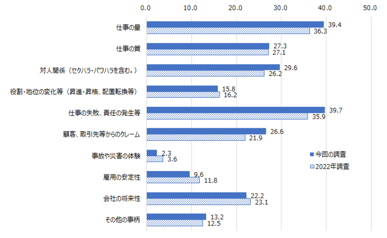 厚生労働省「2023年労働安全衛生調査(実態調査)」結果によると、ストレスの内容をみると「仕事の失敗、責任の発生等」が39.7%で最も高く、次いで「仕事の量」(39.4%)、「対人関係」(29.6%)、「仕事の質」(27.3%)など、評価されにくい状態が続くことが精神的な負担につながっています。