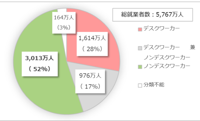 一方、全職種の中でデスクワーカーの割合は約28%、ノンデスクワーカーの割合は52%と約2倍の差があり、全職種で比較するとデスクワーカーは少ない傾向にあります。