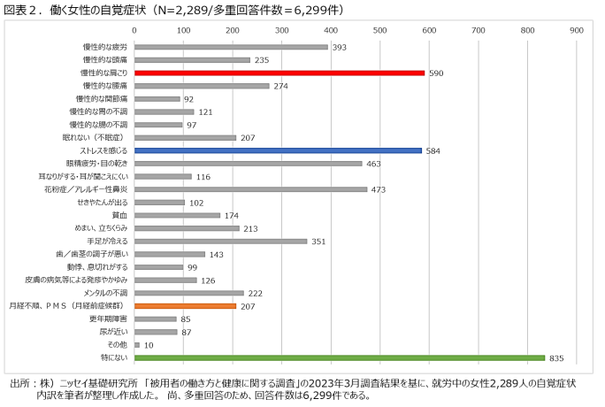 ニッセン基礎研究所が実施した「働く女性の自覚症状(健康問題) 」によると、男性よりも女性の方が「慢性的な肩こり」に悩む割合が高く、ストレスを感じる要因として挙げられます。