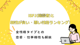 ISFJと相性が良い性格協調性があり、周りの人たちを大切にするタイプENTJ(指揮官)、ISTJ(管理者)ESFP(エンターテイナー)ISFJと相性が悪い性格協調性や責任感に欠けるタイプENTP(討論者)、ESFJ(領事官)、ESTP(起業...