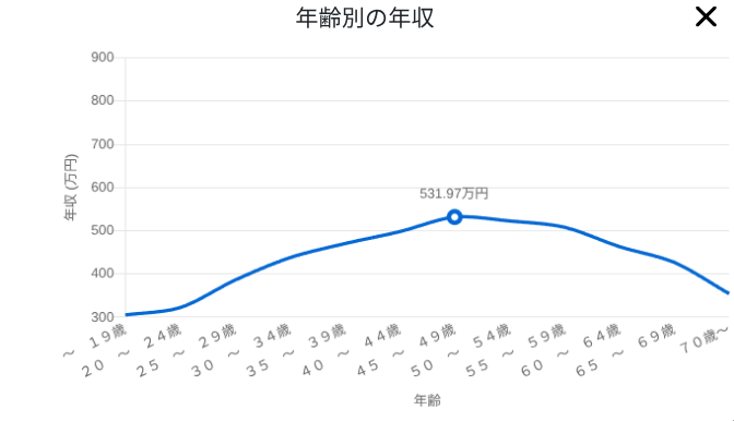 年齢別では、経験年数が15年以上となる45〜49歳の年収が531.9万円と平均年収よりも大幅に増加しているのがわかります。