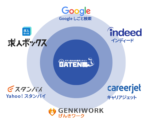 さらにGATEN職に乗せるだけで、Google、Yahoo!、Indeed、求人ボックスなど国内主要の求人検索エンジンへ一斉に、自動で同時掲載。